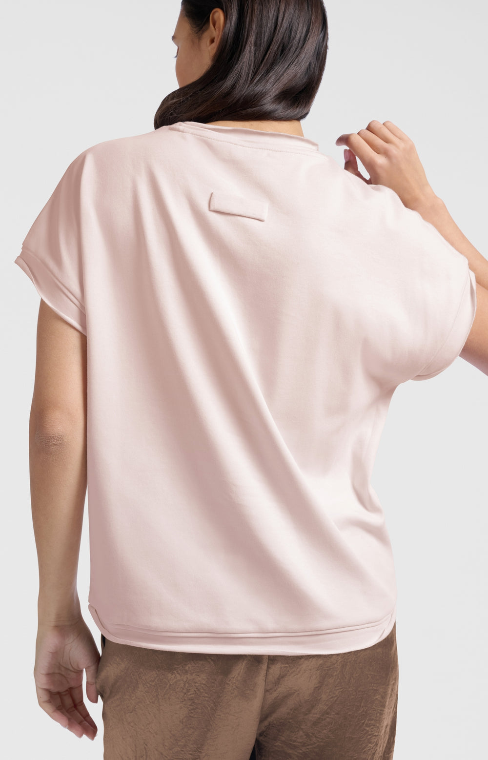 This modern top is made from a structured heavy-weight fabric and features an oversized fit. The short sleeves and round neckline create a minimalist look, while the raw-edge finish adds a subtle, edgy touch. A versatile piece that pairs with any outfit. The model is 174 cm and wears size S.