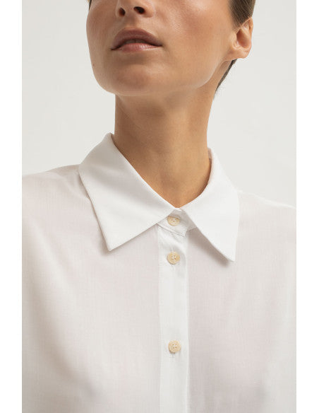 The Danubio shirt features an oversized style with drop sleeves, a ruching under the yoke at the back and a slit cuff. These details add a distinctive touch to the garment, offering comfort and style.